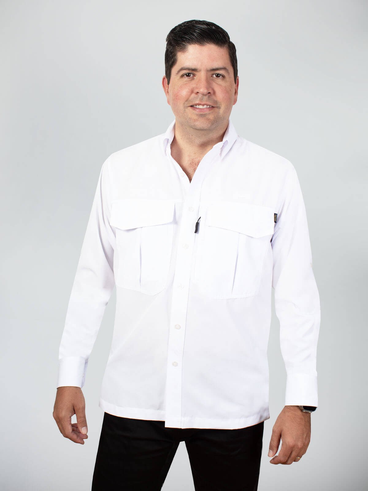 Características: Bolsillos al frente, tela con protección UV, bolsa con cierre en frente, mangas con elevador para doblarse y tela dryfit en la espalda.