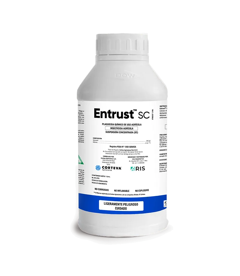 Entrust SC es un insecticida orgánico formulado a base de Spinosad, molécula derivada de la fermentación producida por el actinomiceto Saccharopolispora spinosa. Actúa tanto por ingestión y por contacto, afectando principalmente diversos estadios larvales e insectos picadores-chupadores en un amplio rango de cultivos.