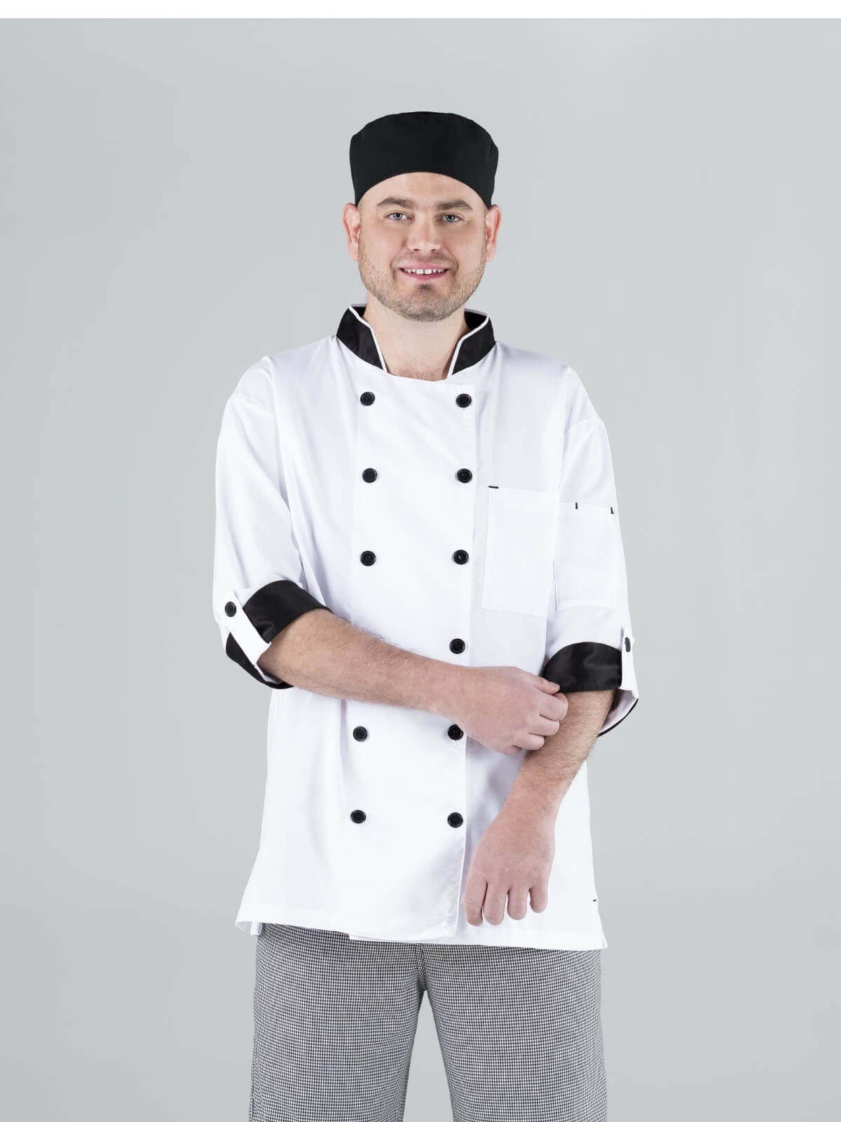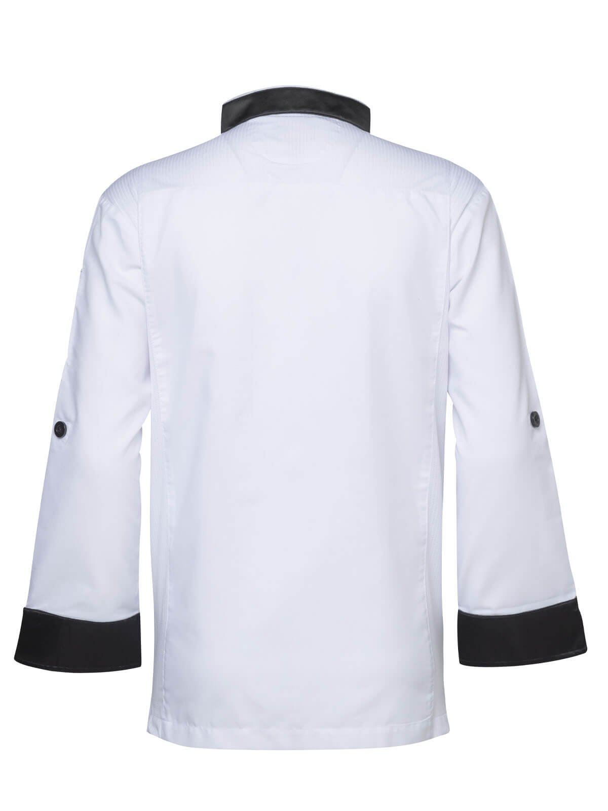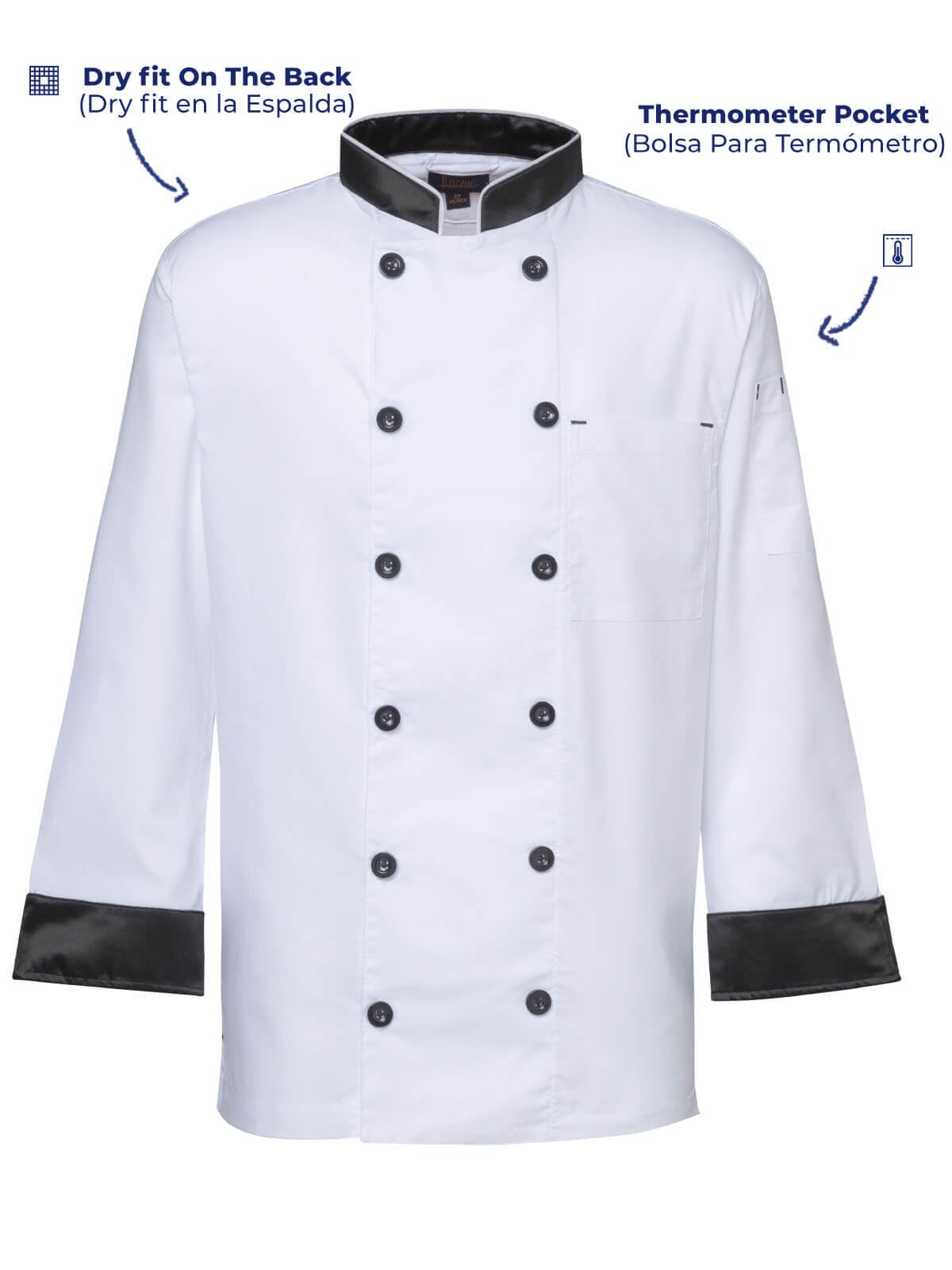 Filipina para chef gabardina con color contrastante en manga, cuello y botones, bolsa para termómetro.