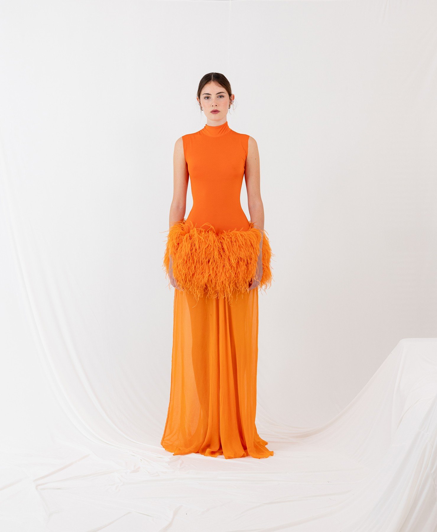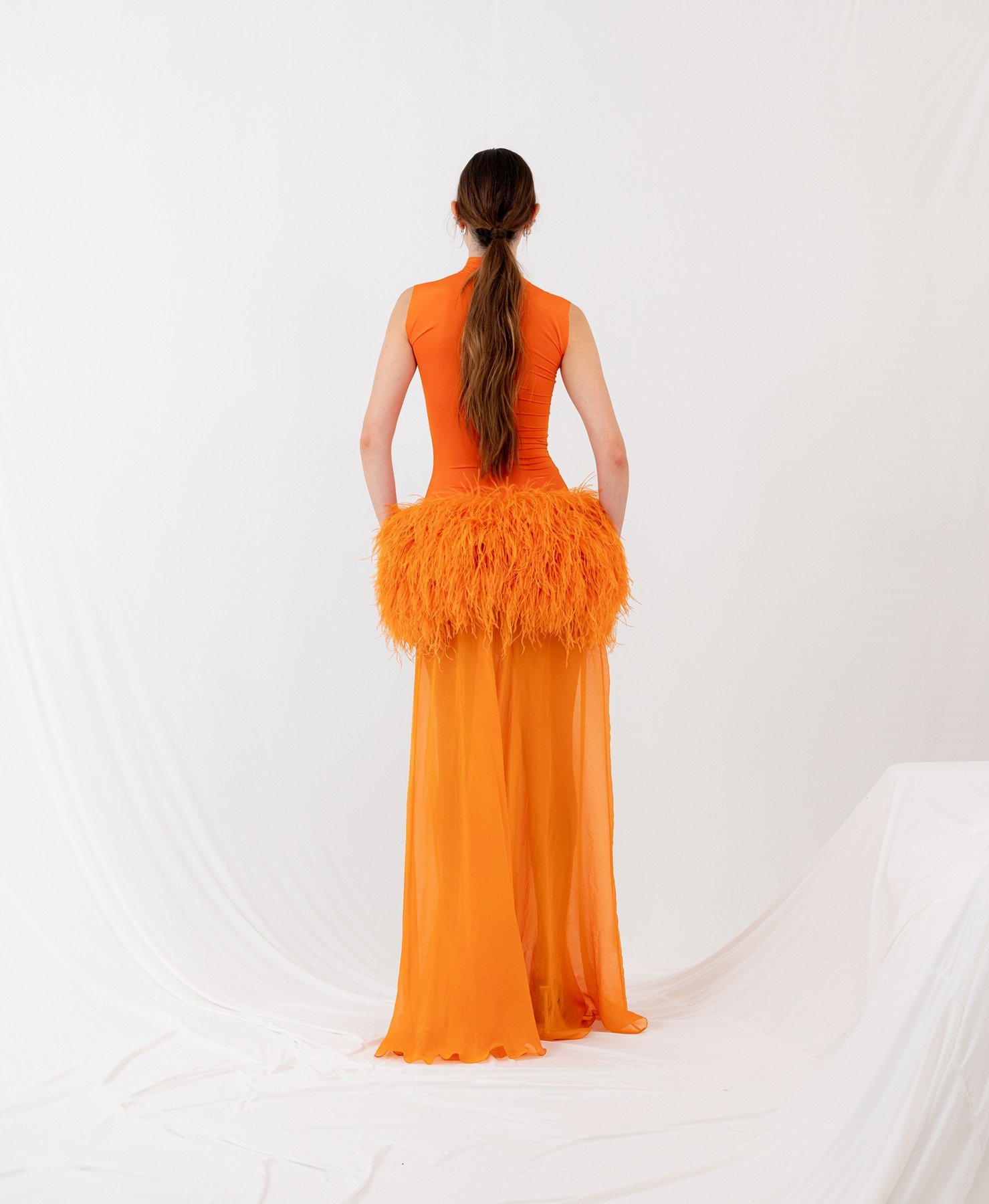 Vestido Naranja de Plumas y Tul con cuello Halter