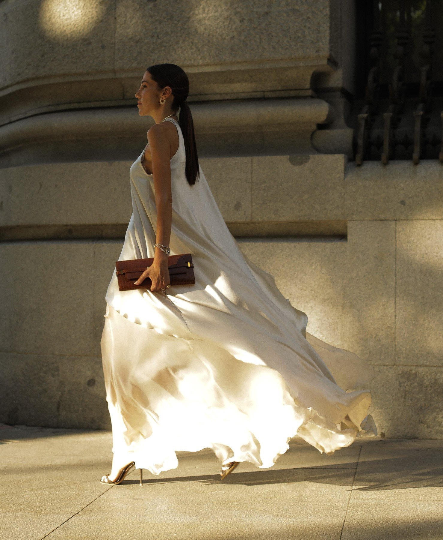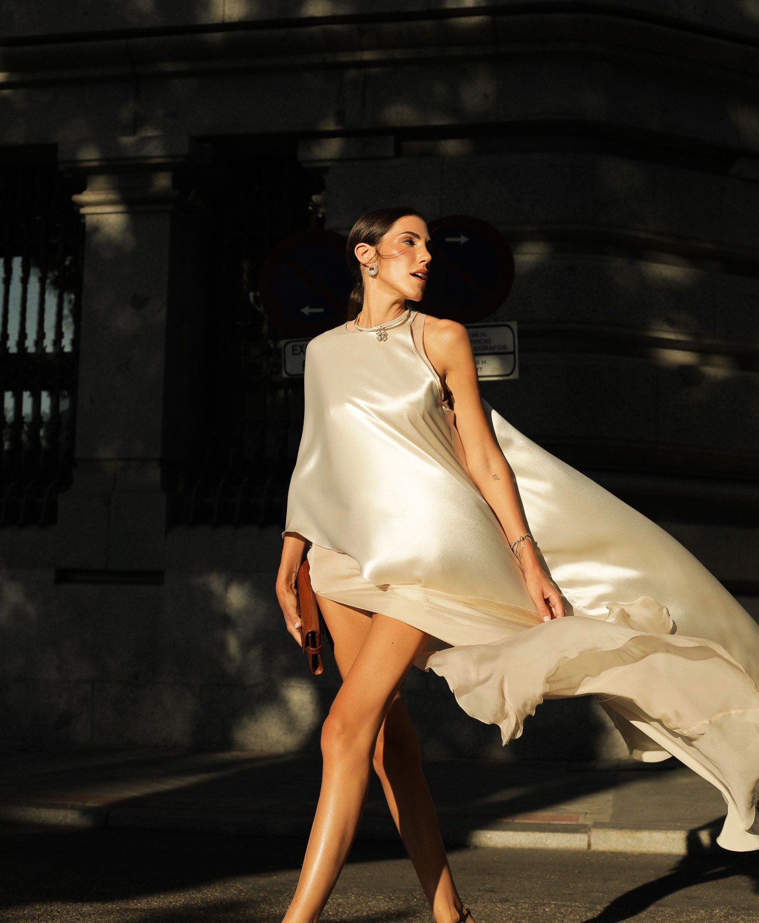 Vestido de Alta Costura para Invitada de Gala color champagne realizado en 2 texturas de seda: muselina y crepe satinado. Asimétrico en mangas y bajo compuesto en 2 capas. Cierre trasero con presilla y escote a la caja. Vestido a Medida por encargo.