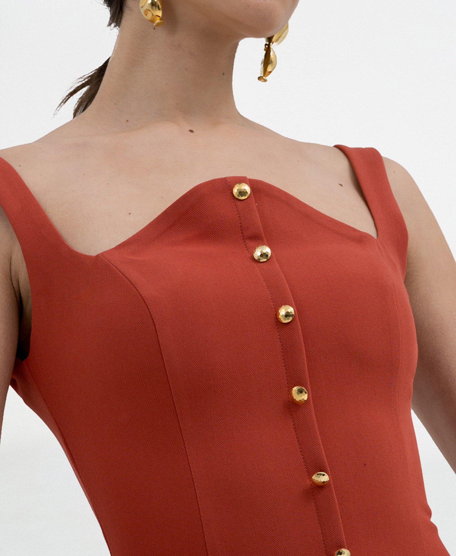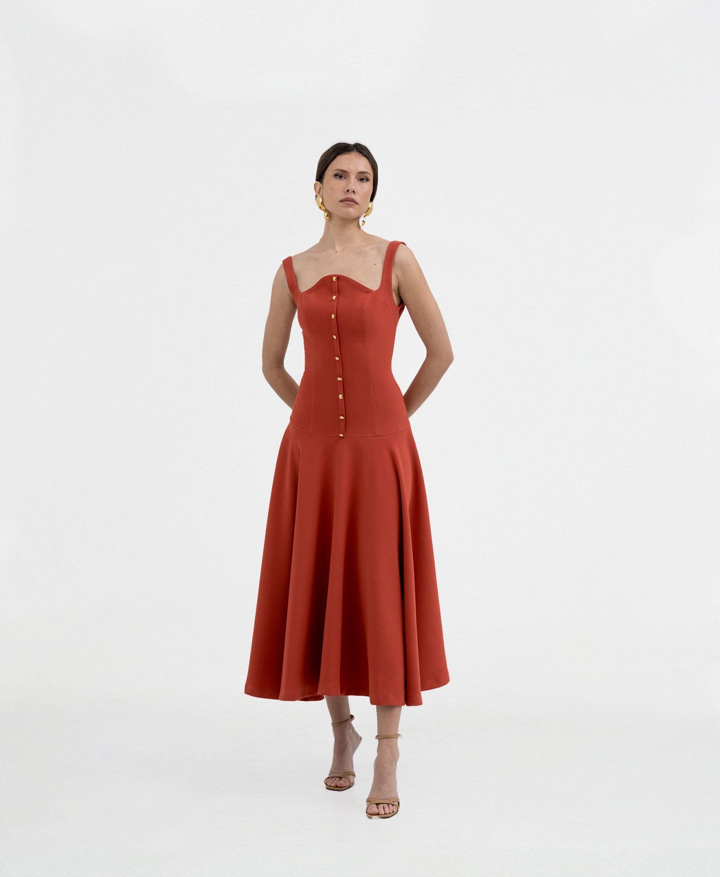 Este vestido midi para invitadas en un sofisticado tono terracota, presenta un escote corazón que realza la silueta, acompañado de botones dorados que recorren el torso para un detalle refinado. Su falda de vuelo aporta movimiento y feminidad. Colección Eterna PV25.