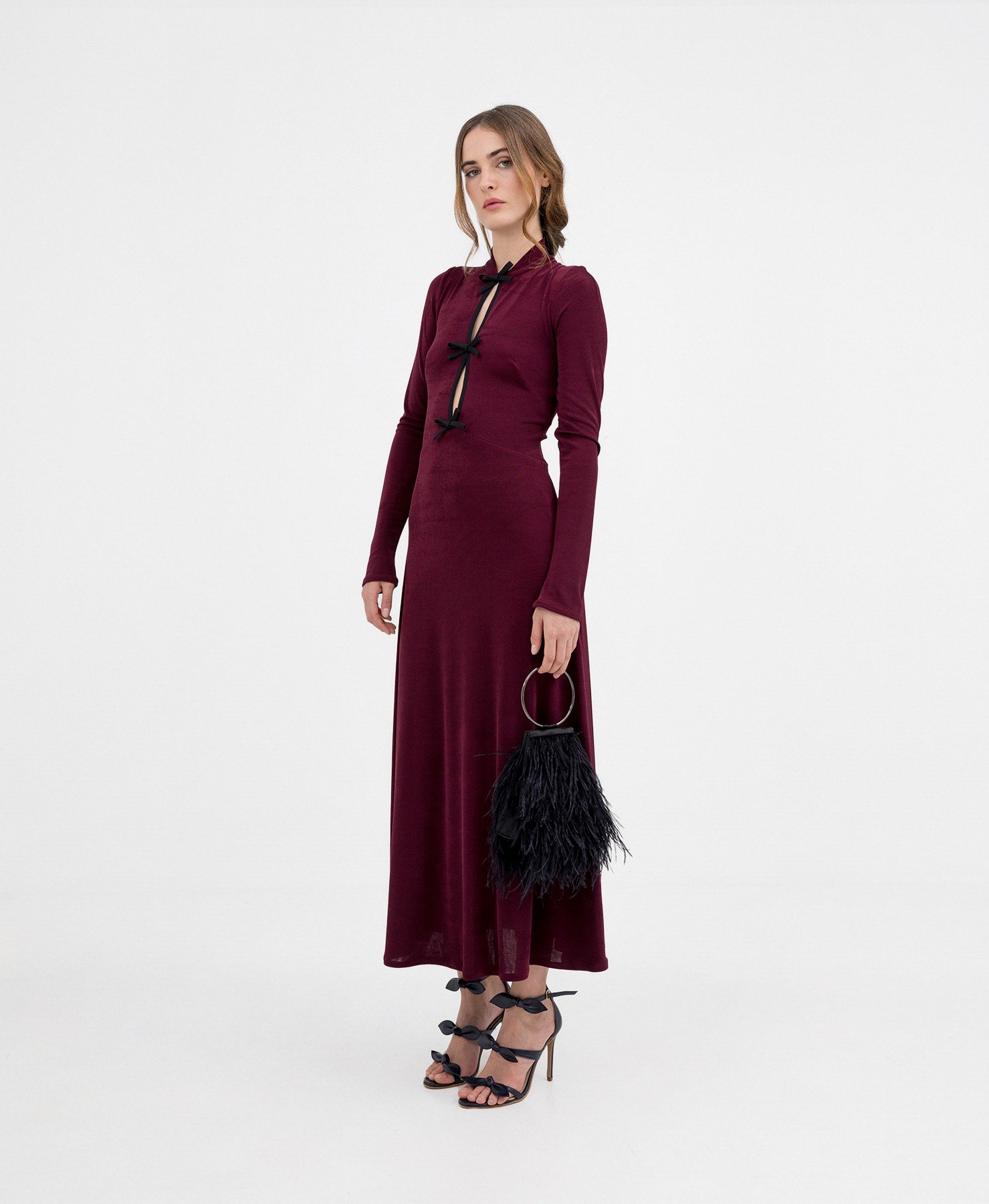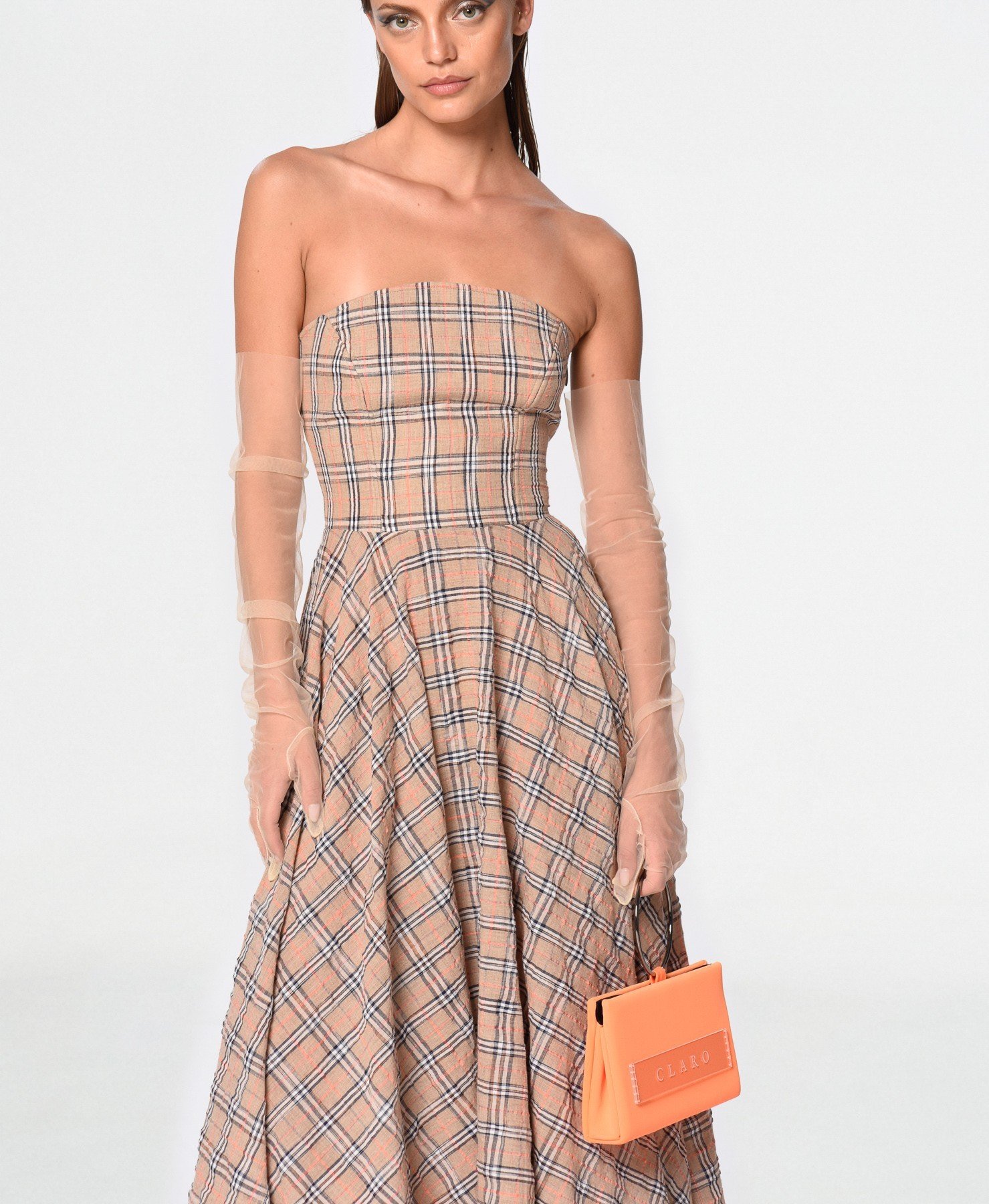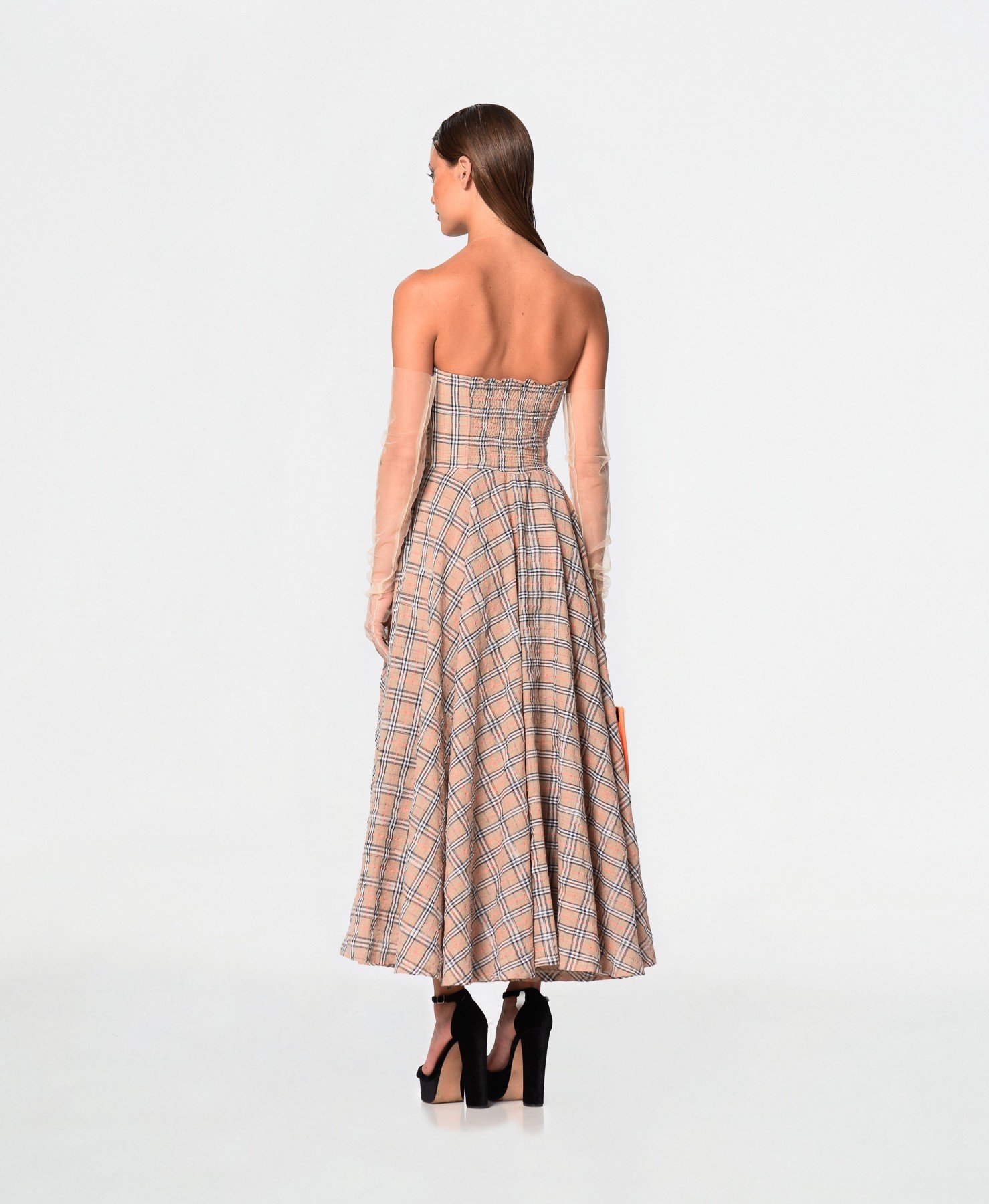 Vestido corte A y escote palabra de honor en un corpiño con refuerzo. Estampado gales tonos camel. Chaqueta a juego, link abajo