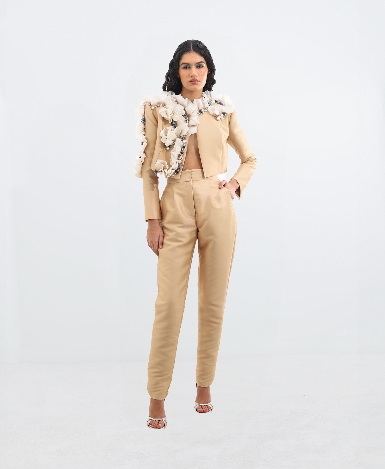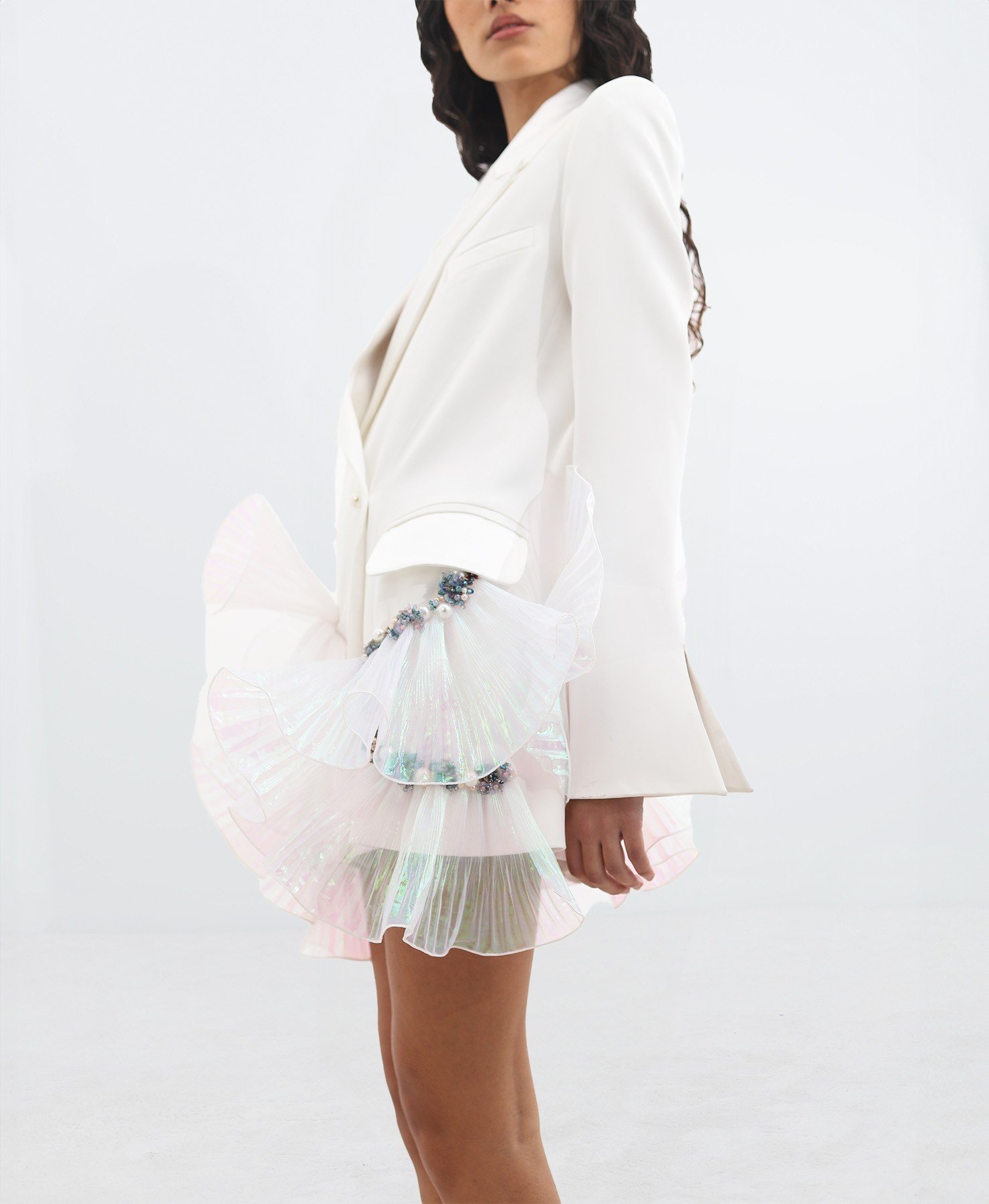 Vestido chaqueta cruzado en crepe de seda blanco, con perlas naturales, cristales y abalorios sobre volante de organdí de seda natural. Vestido ideal para una ocasión especial o un evento importante.