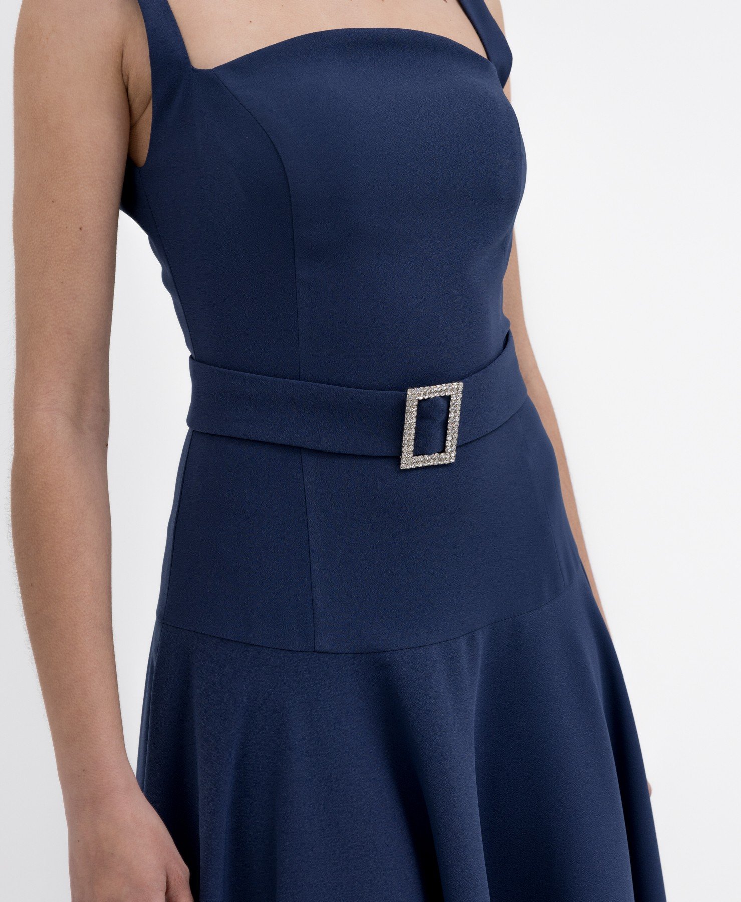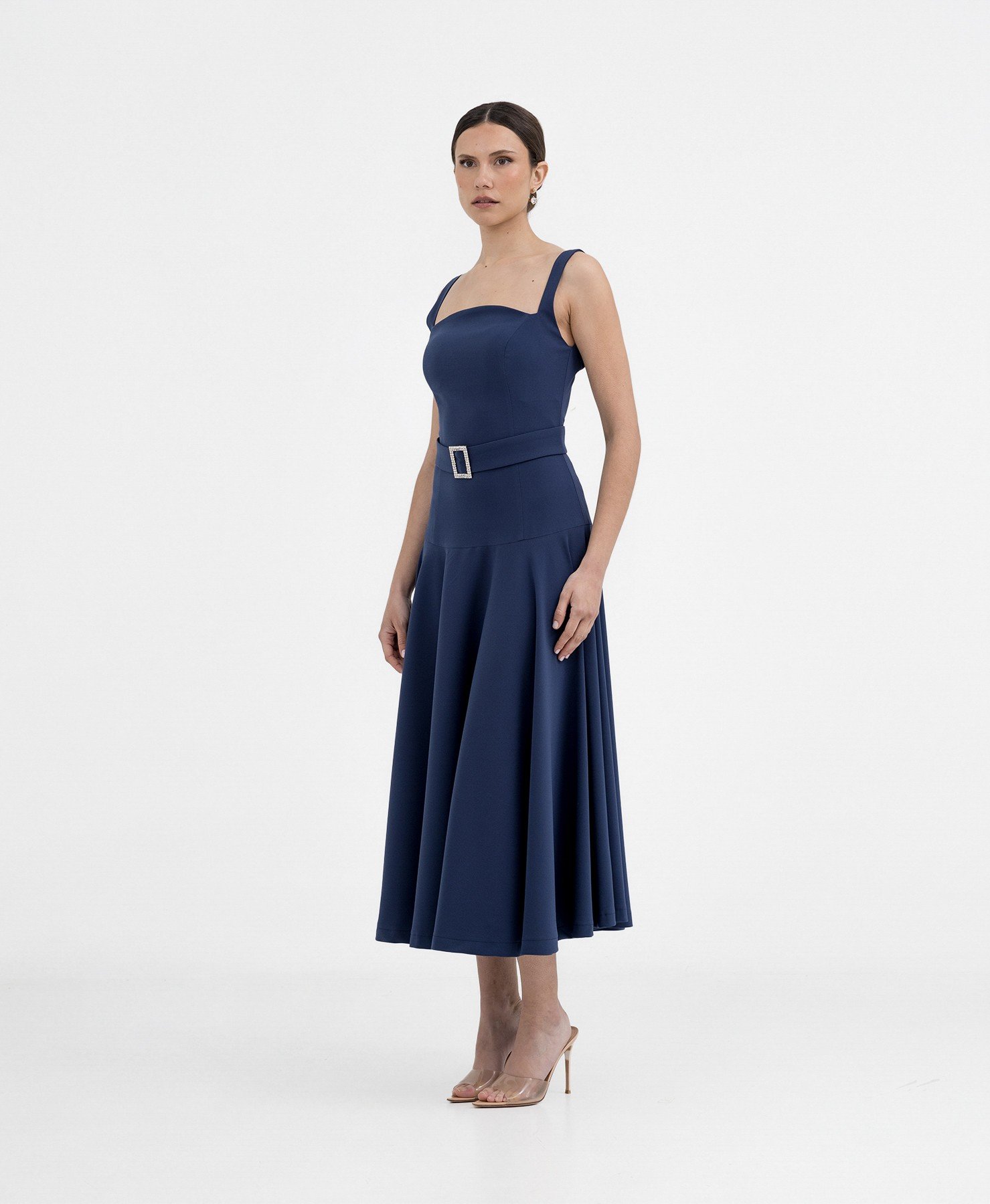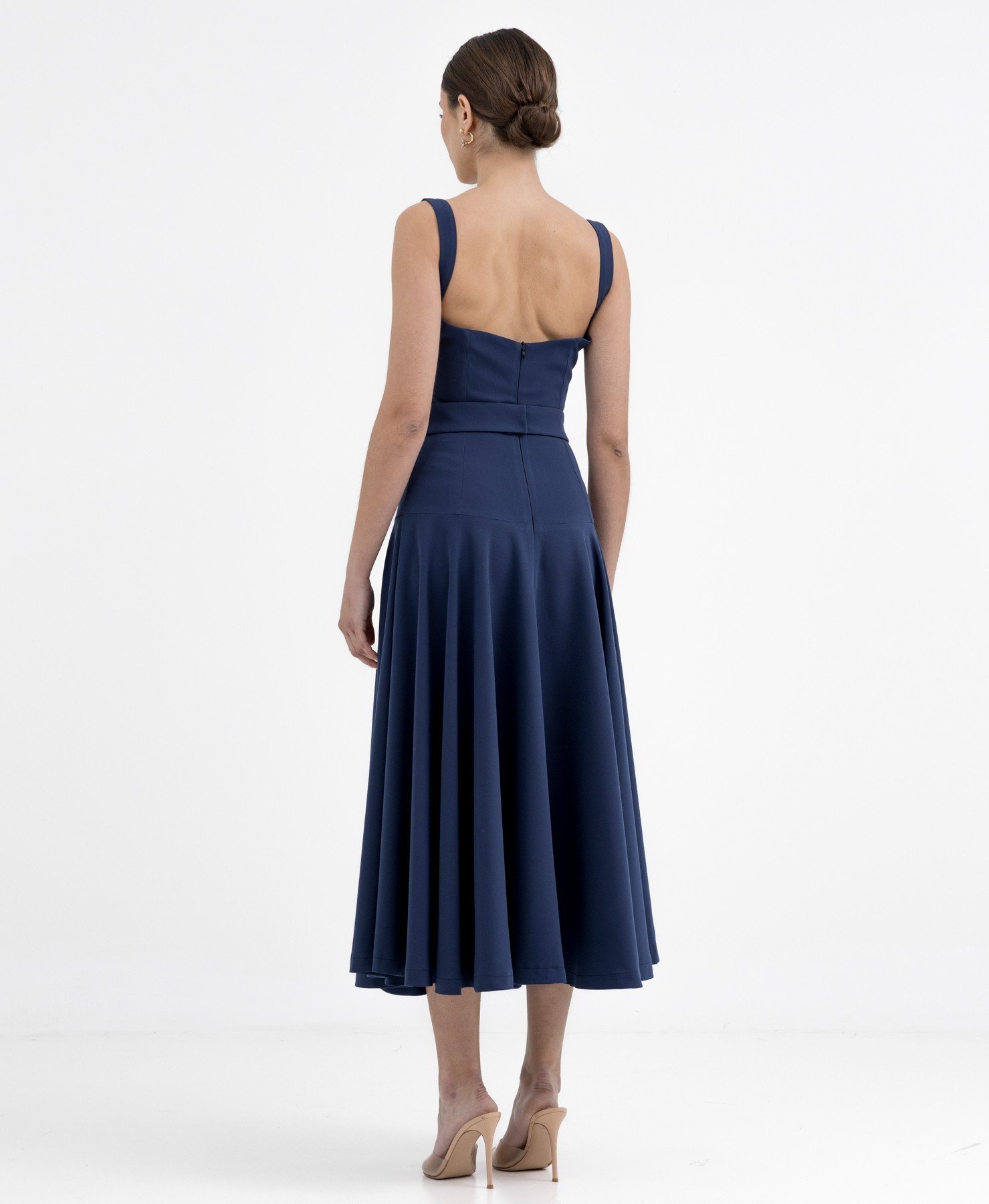 l Vestido Rosae Azul Marino Profundo combina estructura con su escote cuadrado y falda fluida, ofreciendo un look sofisticado y atemporal. Favorece las siluetas reloj de arena, triángulo invertido y rectangular, ya que define el torso y equilibra las proporciones.
