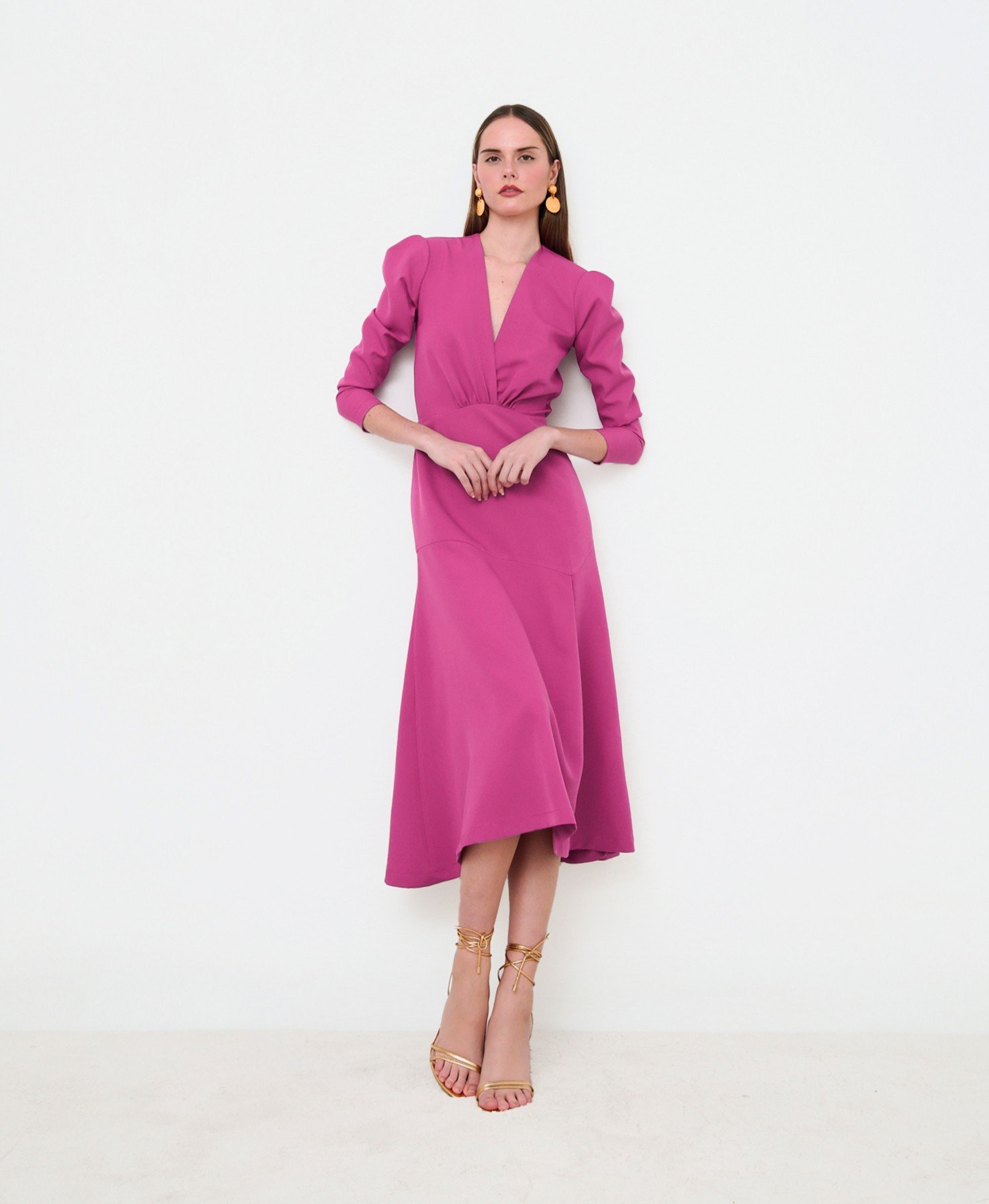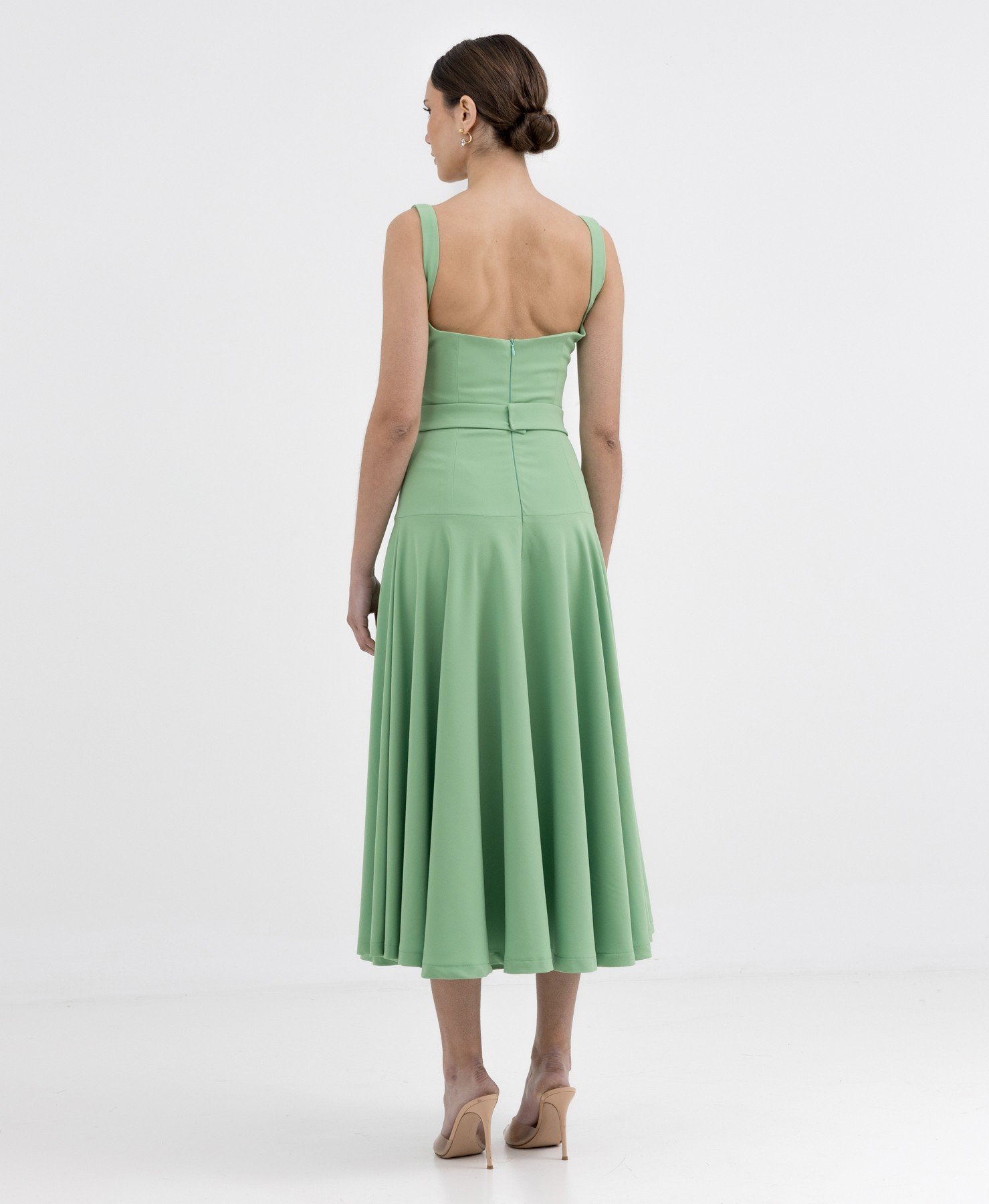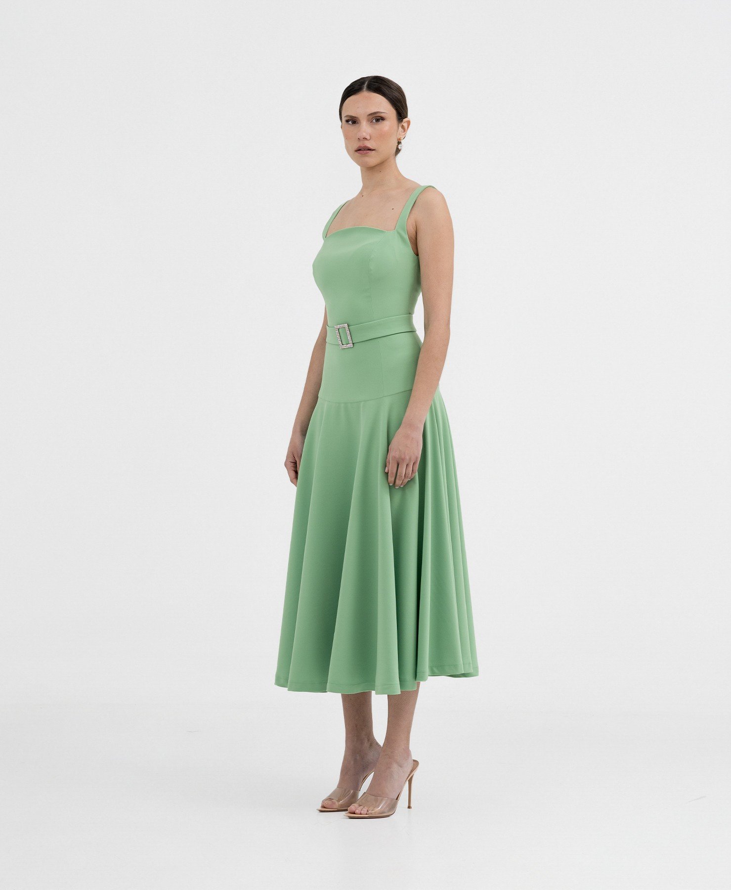 Vestido midi en tono verde menta, con cinturón de hebilla brillante, corte ajustado en el torso y falda fluida. Perfecto para cualquier ocasión elegante. Favorece a cuerpos con silueta reloj de arena, triángulo invertido y rectangular, ya que estiliza la cintura y da equilibrio a la figura.